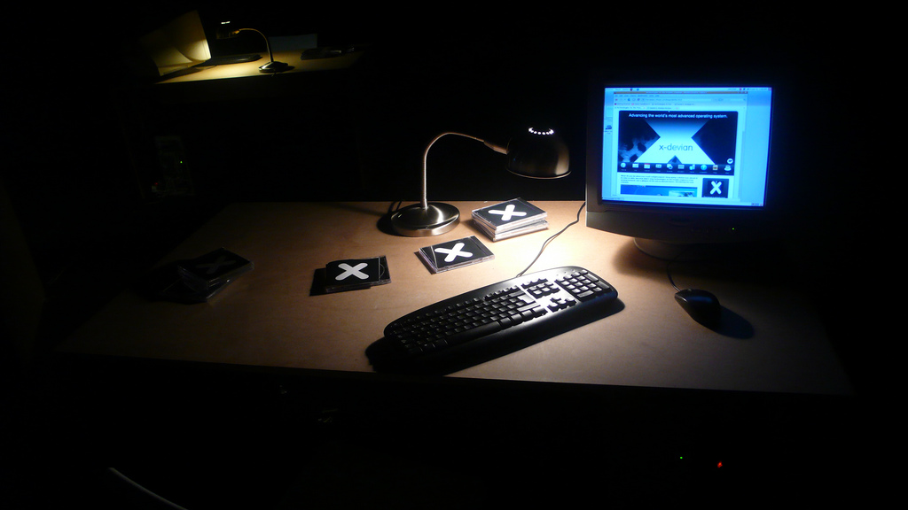 The installation is built up around a two-part ”story” of the operating system X-Devian, which unfolds in an advertizing campaign in which you are introduced to X-Devian as a product, and also in a sort of laboratory environment in which you have access to hands-on exploration of the operating system and to various information on free software. The two narratives exist as parallel and independent thematizations of specific aspects of free software, but the installation also establishes connections between them that are complex, problematic and subversive. And, in these connections, in the encounter bewtween the two narratives, exchanges, correlations and fractures emerge that open possibilities for new conceptions of free software, in the general consciousness as well as in the free-software-environment’s self-understanding.