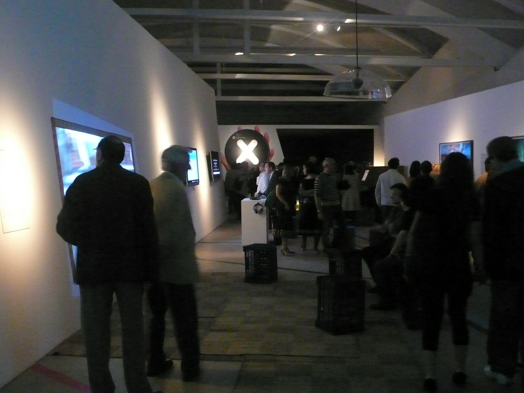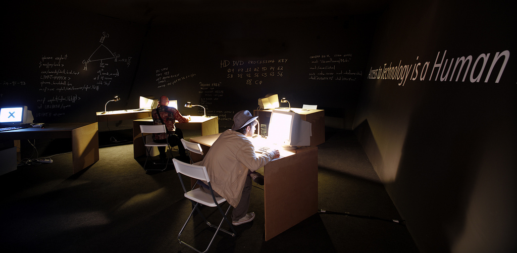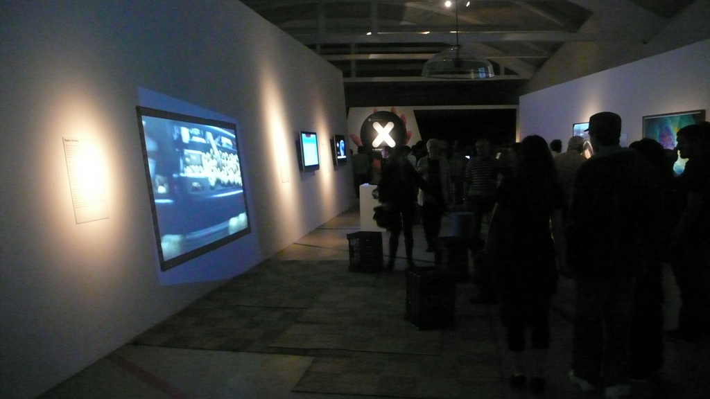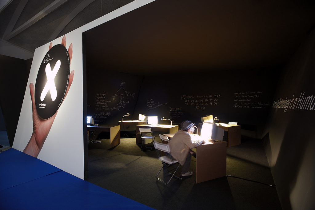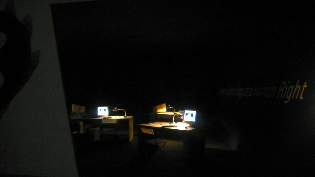 While X-Devian’s first part communicates using visual and linguistic simplicity (symbolized by the black-and-white graphics) and focuses on ”the product”, the work’s second part is much more complex and non-centered (symbolized by – among other things – the blacked-out windows and the inscrutable configurations of computer parts that are spread out on the tables). Here you can explore texts, programs and video-files about free software. Here free software constitutes a space for activity integrated in a physical reality of material, human beings and energy (It’s also here that Andujar runs his workshops). Here there’s no advertizing for a fictitious piece of software. Here you are invited and challenged both on a personal and collective level to participate in an actual existing software culture.