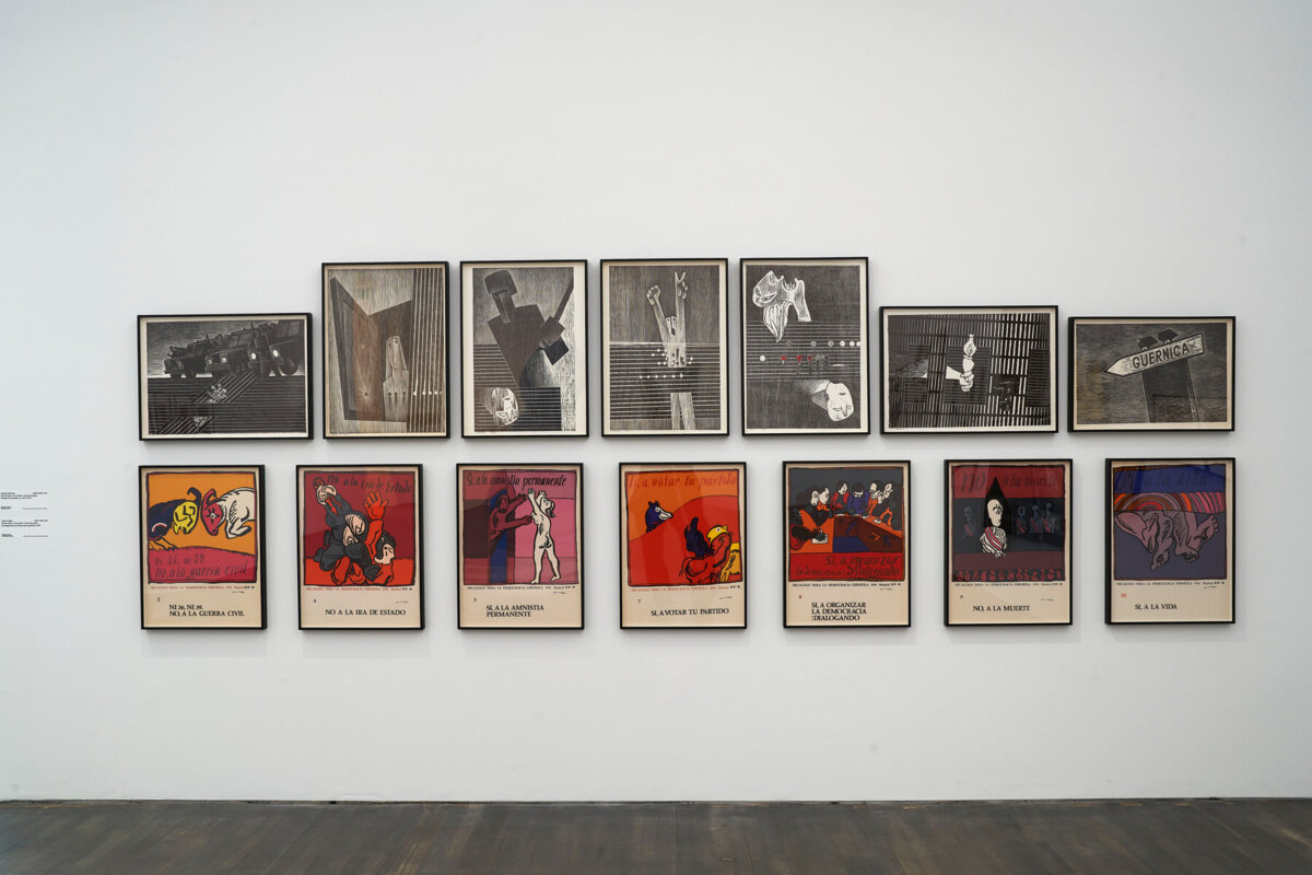 Vue de l’exposition Résistance. The power of the image, S.M.AK., Gand, dans le cadre d’Europalia España, du 29 novembre 2025 au 8 mars 2026, Agustín Ibarrola, série « Paisajes de Euskadi », José Ortega , Estampa popular de Madrid, Decálogo Para La Democracia Española ,1976 © Photo : We Document Art
